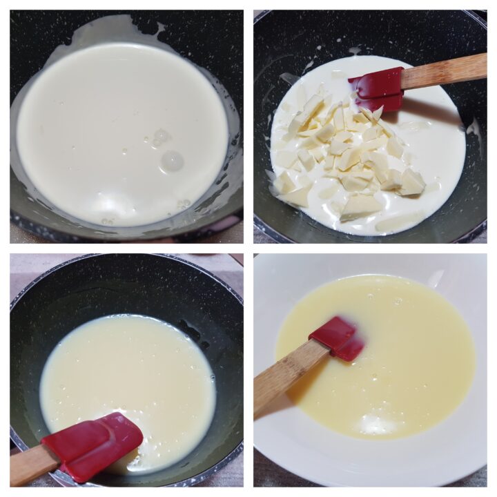Come prima cosa in un pentolino versare la panna fresca liquida e lasciare sobbolire, unire il cioccolato bianco tritato in precedenza al coltello e mescolare accuratamente fino a sciogliersi completamente. Lasciare raffreddare per un’oretta. Occorrerà che la ganache al cioccolato bianco dovrà essere fredda per essere utilizzata.