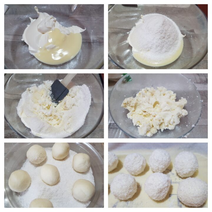 In una ciotola capiente versare il mascarpone e il latte condensato e amalgamare con cura, aggiungere il cocco rapè (40 g) e mescolare accuratamente prima con una spatola e poi con le mani ottenendo un impasto compatto ma morbido. In un piatto a parte adagiare il cocco rapè quanto basta. Realizzare la pralina con le mani in modo da ricavare una pallina e adagiarla nel cocco rapè per la guarnizione finale muovendola delicatamente in modo da ricoprire l’intera superficie. Continuare così con il resto dell’impasto. Predisporre tutte le praline di cocco su un piatto da portata e adagiare in frigo.