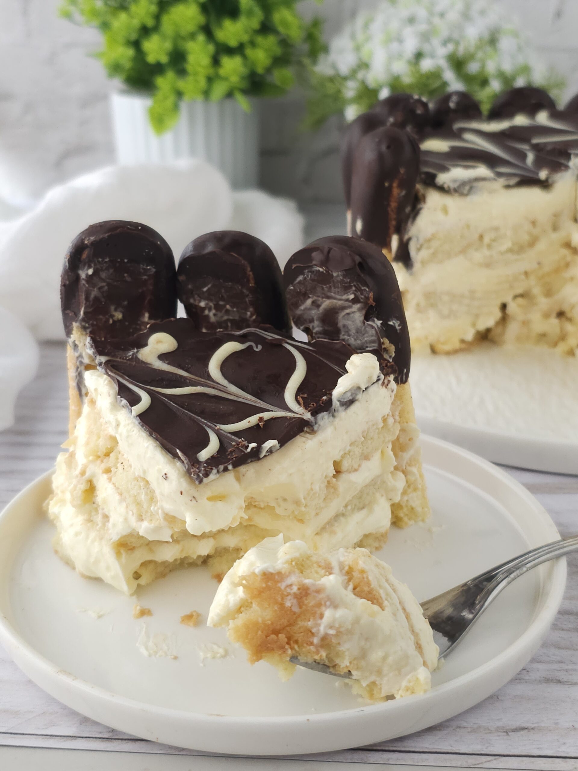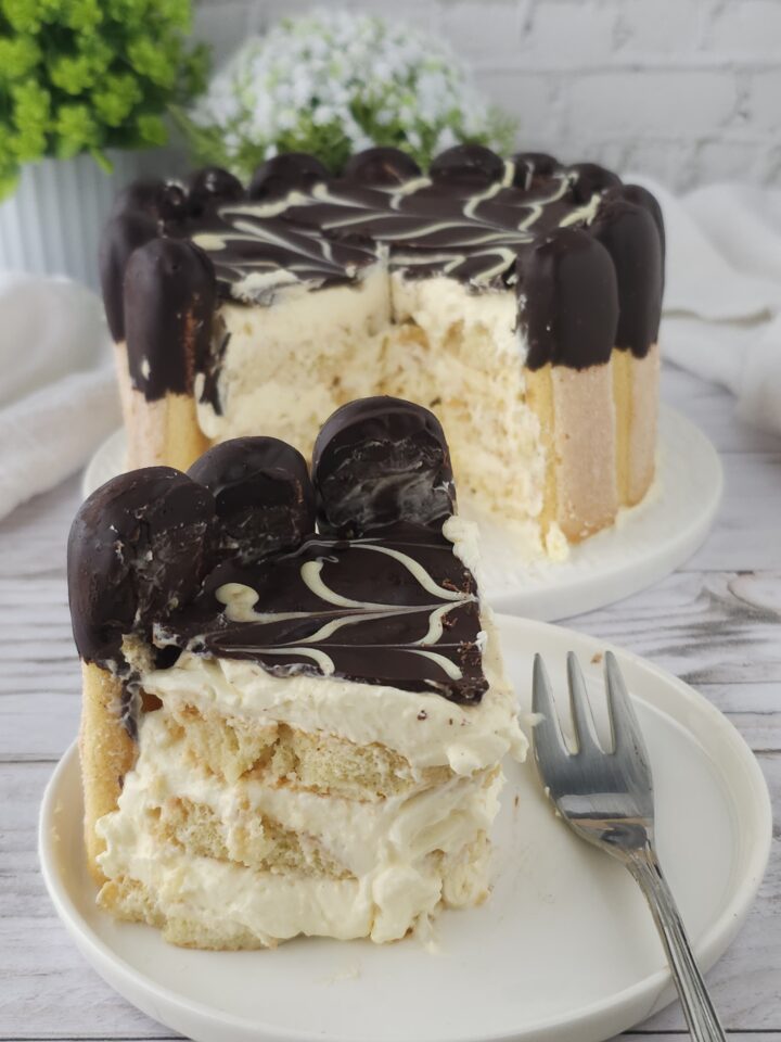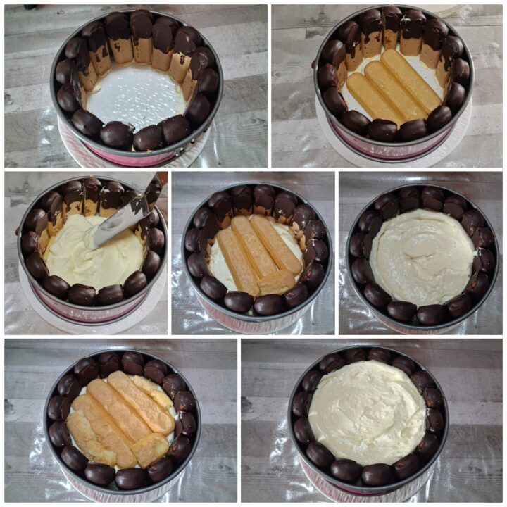Come prima cosa occorrerà prima di tutto tagliare un centimetro di punta dei savoiardi, e glassare le restanti punte, quindi dell’altra estremità dei savoiardi con del cioccolato precedentemente fuso e lasciarli asciugare su un vassoio foderato da carta forno in frigo per 30 minuti. Quando saranno freddi, prendere un piatto da portata e adagiare un anello in acciaio oppure semplicemente un cerchio apribile di una stampo tondo da 20 cm e predisporre i savoiardi a corona cercando di incastrarli per bene senza farli cadere. Io ho voluto “fissare” ogni base del savoiardo sul piatto con un pò di crema diplomatica. Predisporre poi sul fondo del piatto dei semplici savoiardi bagnati solo leggermente in un pò di latte o bagna alcolica. Versare uno strato di crema diplomatica sulla base dei savoiardi, fare un secondo strato di savoiardi imbevuti nel latte, verare altra crema diplomatica, altro strato di savoiardi e infine altra crema diplomatica. Adagiare la teglia in frigo a riposare per circa 6-8 ore.