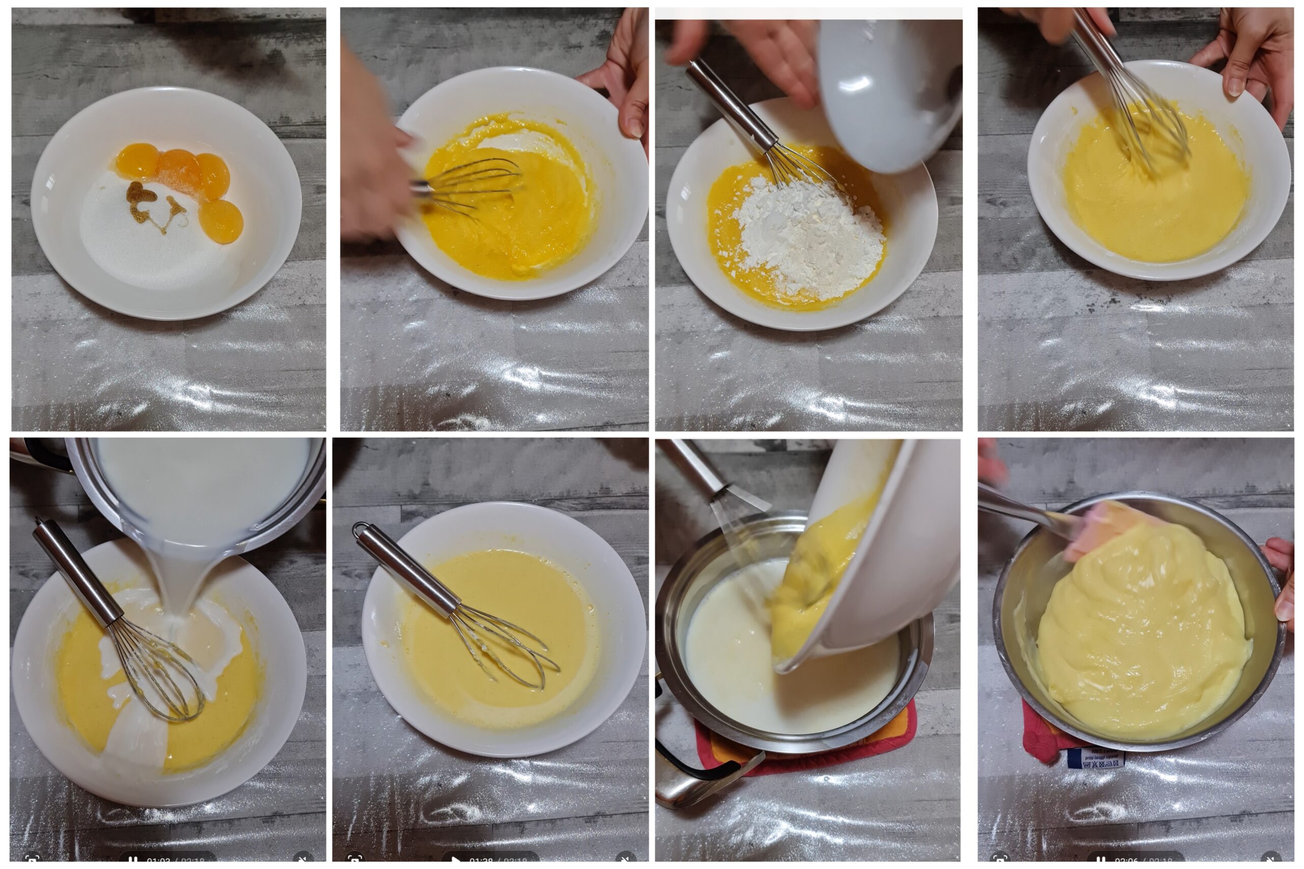 Per realizzare la crema diplomatica iniziamo prima dalla preparazione della crema pasticciera. Versare il latte in una casseruola e adagiare sul fuoco a riscaldare. A parte in una ciotola con una frusta a mano sbattere i tuorli con lo zucchero e l’essenza di vaniglia. Aggiungere poi l’amido di mais, il sale e amalgamare per bene. Versare il composto di uova nel latte e portare ad ebollizione mescolando continuamente con la frusta per evitare che si formino dei grumi e far addensare completamente. Togliere dal fuoco e adagiare la pellicola per alimenti a contatto e lasciare raffreddare a temperatura ambiente per qualche ora.