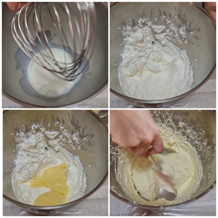 Quando la crema sarà fredda, montare a parte in una ciotola la panna fresca a neve ben ferma. Aggiungerla in un paio di riprese alla crema pasticciera, con l’aiuto di una spatola. Mescolare delicatamente per evitare di smontare il composto fino ad ottenere una crema liscia e ben amalgamata. Adagiare in frigo a rassodare per 15 minuti.