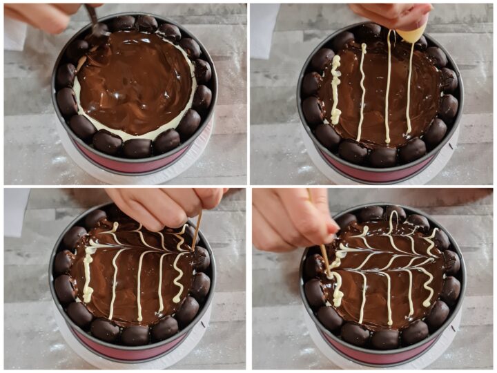 Passate le ore di riposo. Sciogliere a bagnomaria del cioccolato fondente assieme a un pò di latte o panna fino ad ottenere una glassa lucida. In un altra ciotola sciogliere del cioccolato bianco. Riprendere la torta dal frigo, versare la glassa al cioccolato fondente livellando per bene e infine decorare con delle strisce di cioccolato bianco fuso e con l’aiuto di uno stuzzicadenti creare dei motivi come in foto. Togliere l’anello con delicatezza e predisporre la torta nuovamente in frigo fino al momento di servirla.