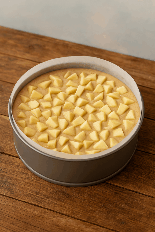 Versa il composto nella tortiera, decora con le fettine di mela e cuoci a 180°C per 40–45 minuti.