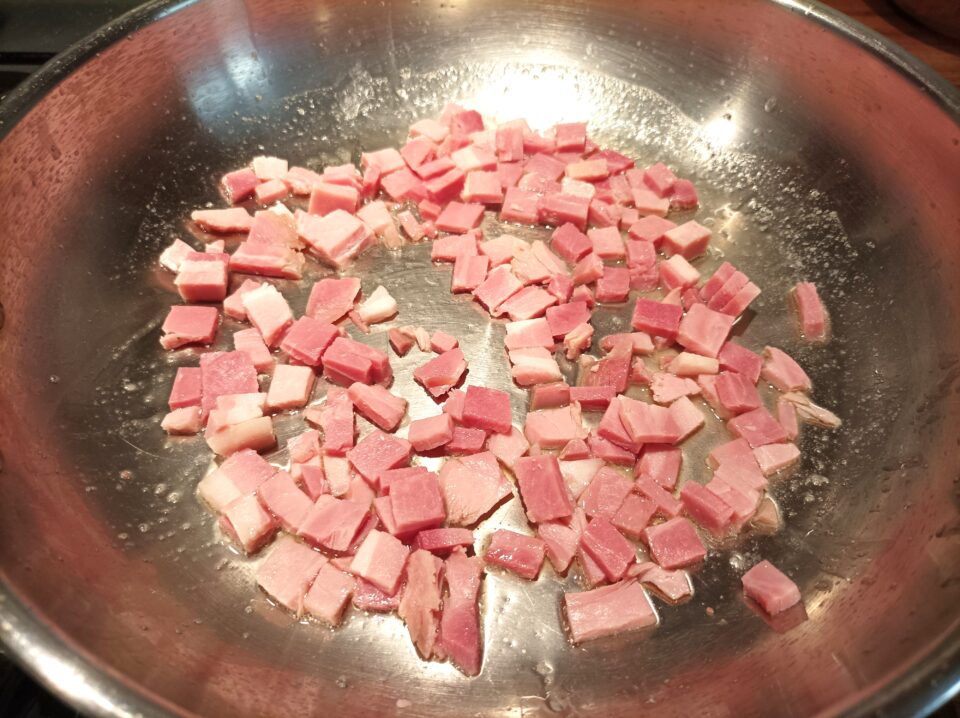 Preparate il condimento, mettete in padella un filo di olio, fate riscaldare e aggiungete il prosciutto a dadini. Fate rosolare per 2 minuti e poi aggiungete la panna, mescolate il tutto e lasciate andare per 1 minuti. Spegnete e nel frattempo cuocete la pasta aggiungendo il sale nell’acqua.