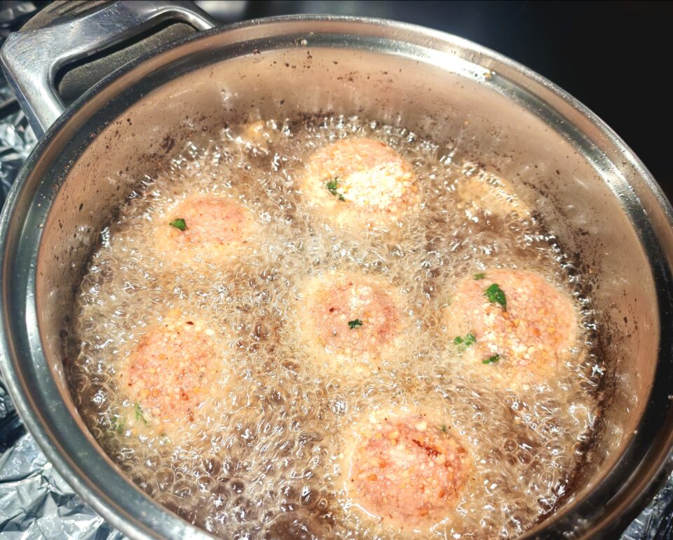 Nel tegame mettete abbondante olio e quando avrà raggiunto la temperatura di 180° circa e iniziate a immergere le polpette.