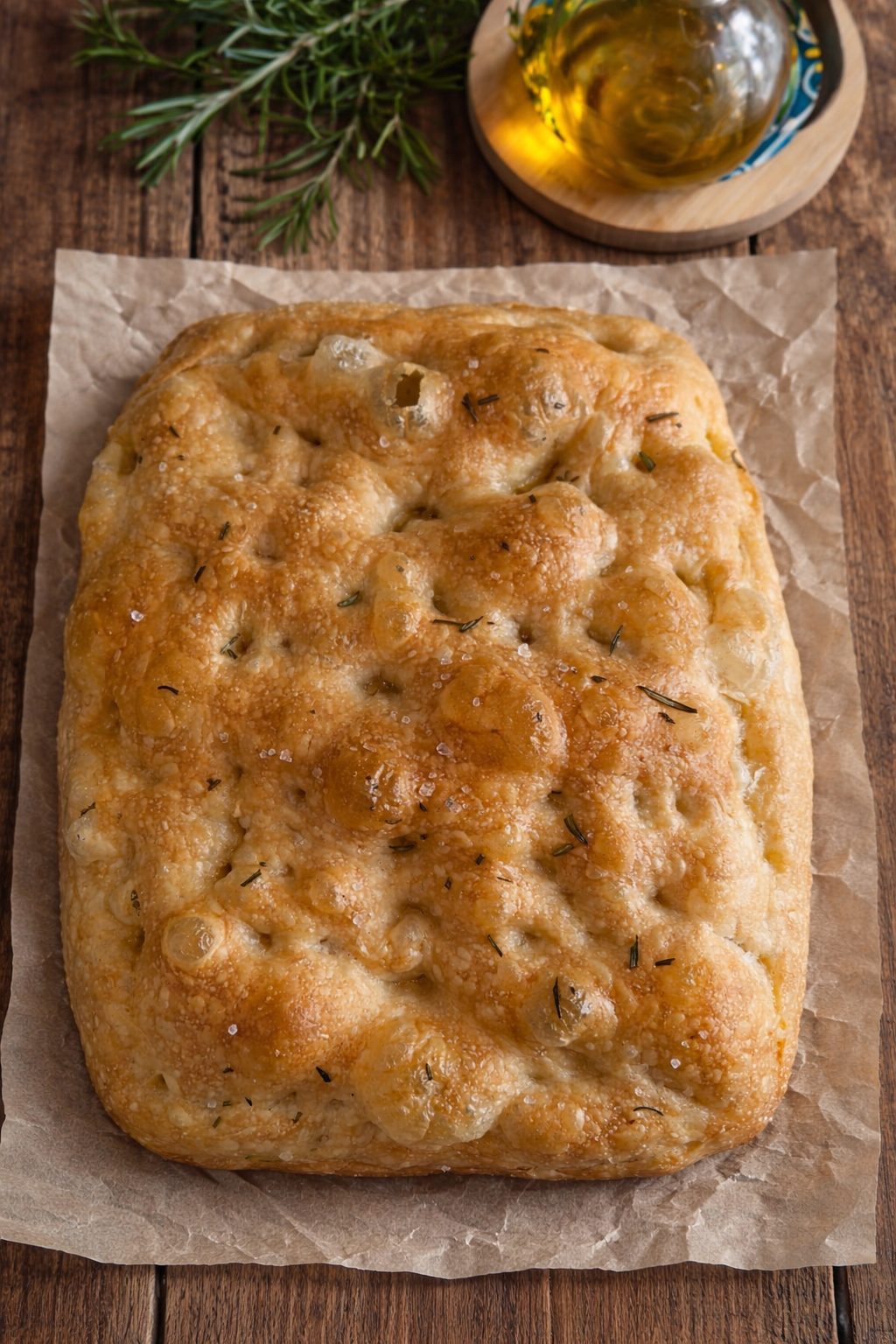 Condisci con abbondante olio extravergine d’oliva, sale in fiocchi e, se ti piace, qualche ago di rosmarino. Cuoci in forno statico appoggiando la teglia direttamente sul fondo del forno: questo aiuterà a ottenere una base ben croccante. Inforna a 230°C per circa 15 minuti, poi abbassa a 200°C e continua la cottura per altri 10 minuti. Lascia riposare la focaccia almeno 15 minuti prima di tagliarla: il risultato sarà una focaccia alta e soffice con mille bolle, dorata sopra, croccante sotto e incredibilmente morbida all’interno.