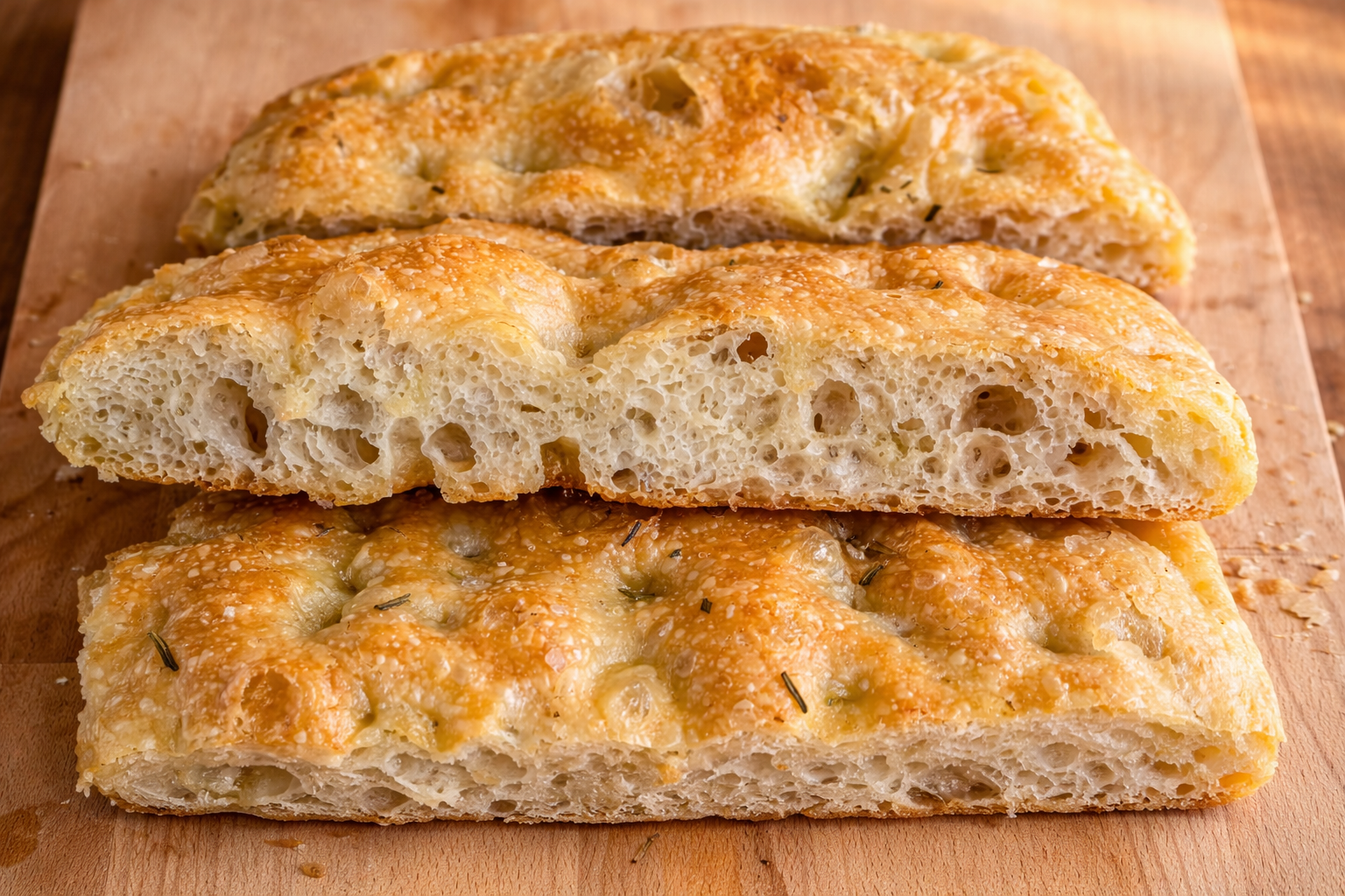 Se vuoi mantenerla più a lungo, puoi congelarla senza problemi. Tagliala prima a tranci o quadrotti, avvolgila bene nella pellicola e poi riponila in un sacchetto per freezer. In questo modo la focaccia alveolata si conserva fino a 2 mesi.