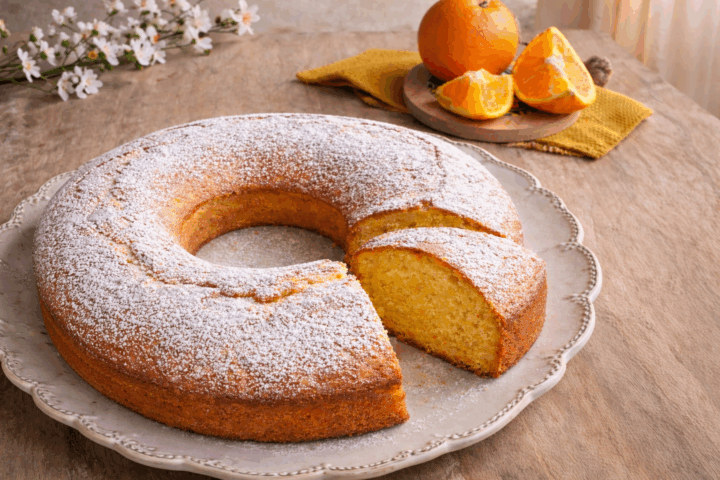 Versa l’impasto in uno stampo imburrato e infarinato, io ho usato uno stampo per ciambelle, ma va bene la classica tortiera rotonda 26 cm di diametro. Cuoci in forno statico preriscaldato a 180°C per circa 40–45 minuti, nel ripiano centrale del forno. A fine cottura, fai la prova stecchino. Una volta cotta, lascia raffreddare completamente la torta prima di sformarla. Completa la tua torta Pan d’arancia siciliana con una spolverata di zucchero a velo e servi: il giorno dopo sarà ancora più buona. 🍊
