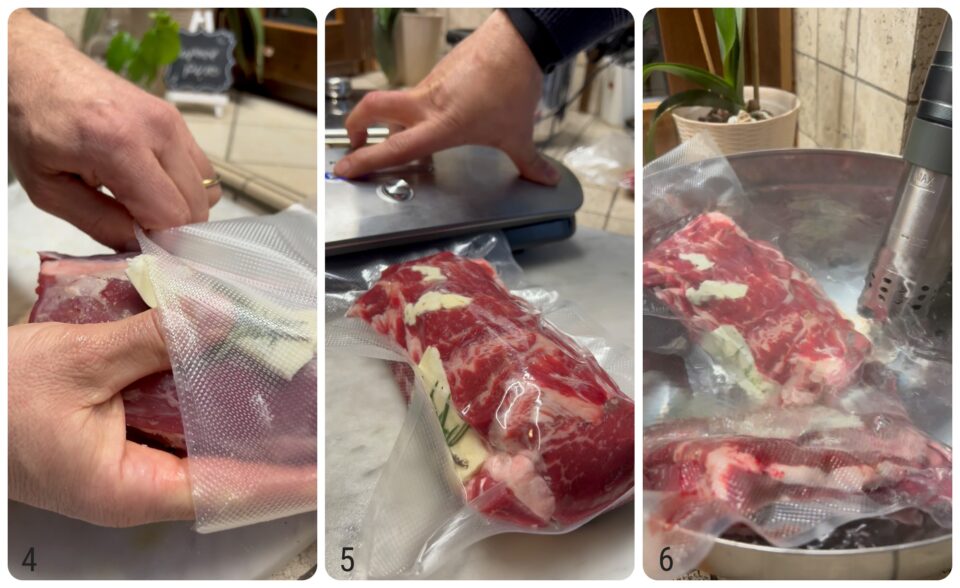 Mettete nella busta (fate prima un risvolto all’esterno per non sporcare la busta e avere problemi di sigillatura) (4) e sigillate sottovuoto (5).