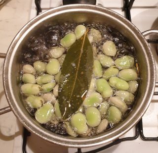 In un pentolino portiamo a bollore l’acqua, aggiungiamo il sale e versiamo le fave e l’alloro. Lasciamo cuocere per 25 minuti, scoliamo e lasciamo intiepidire. Serviamo.