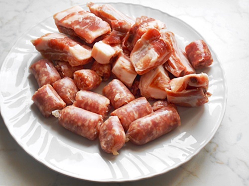 Tagliate a tocchetti la salsiccia e sistemate anche le costine nel piatto.