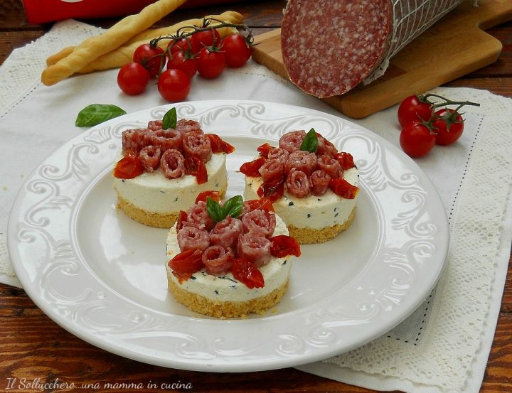 Mini cheesecake con mousse di ricotta, salame e pomodorini confit