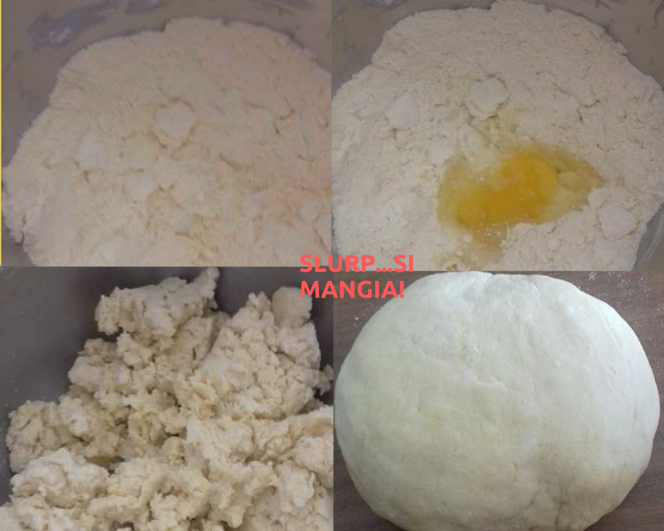 In una ciotola, mettete le due farine setacciate, il sale e lo strutto, quest’ultimo a temperatura ambiente ed iniziate ad impastare formando un composto sabbioso. Aggiungete l’uovo e man mano il vino e l’acqua. Lavorate fino a formare un panetto che poi avvolgerete nella pellicola e farete riposare almeno per un’ora in frigorifero.