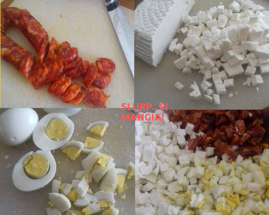 Nel frattempo, prendete il salame , togliete la pelle e tagliatelo a piccoli pezzi, fate la stessa cosa con la “tuma” e con le uova sode e raccogliete il tutto in una terrina.
