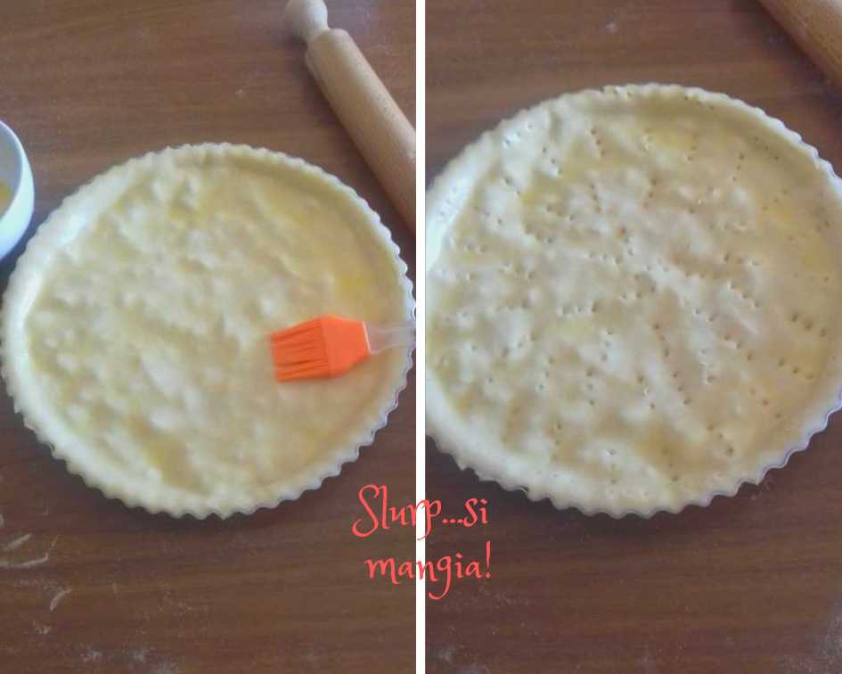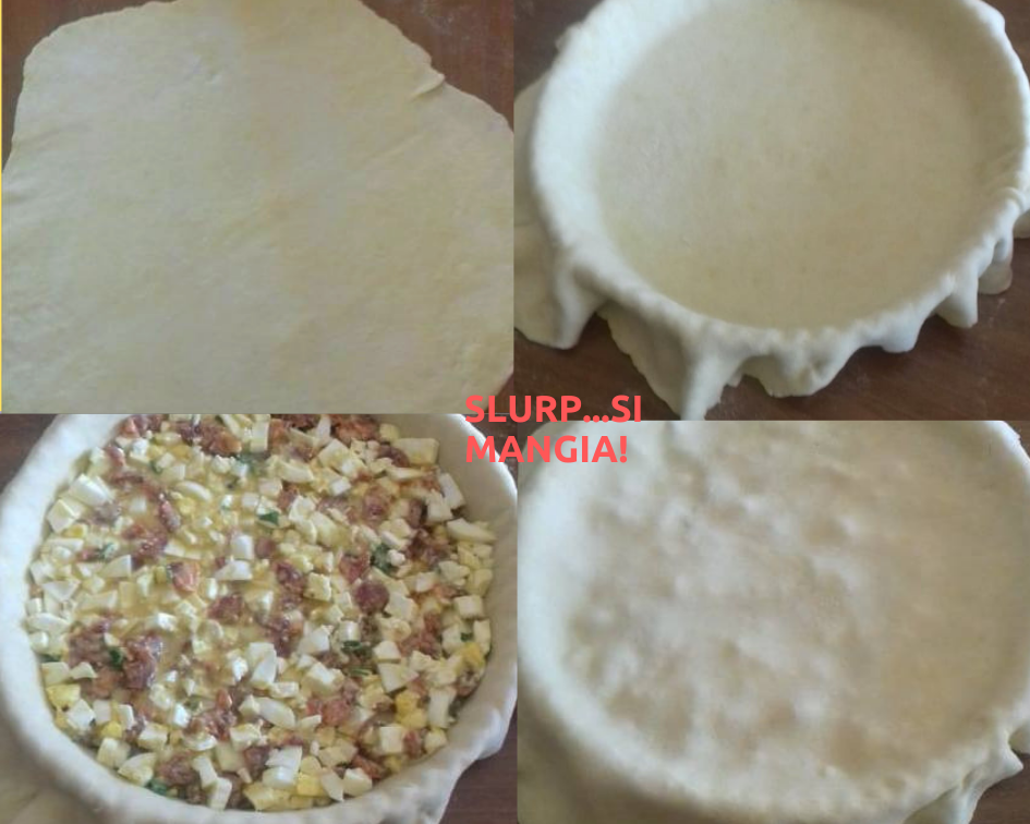 Ora prendete il panetto, dividetelo a metà e tirate due sfoglie, una un po’ più grande dell’altra, quindi imburrate una teglia di circa 24 cm di diametro e copritela con la sfoglia più grande. Versate il composto di salame e uova e chiudete con l’altra sfoglia. Sigillate bene i bordi e tagliate la pasta in eccesso.
