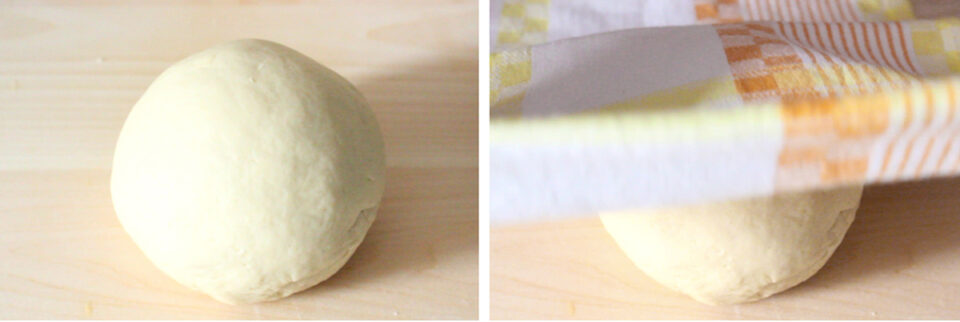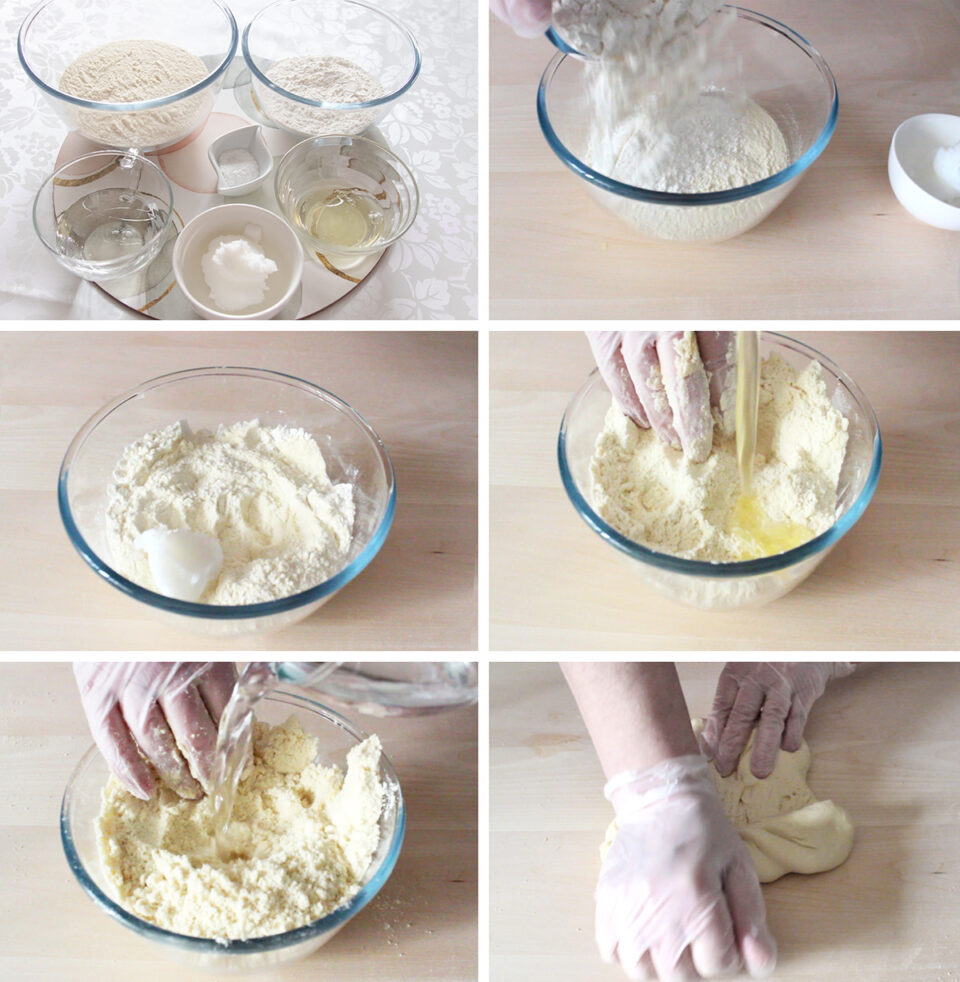 Intanto ho disposto dentro una ciotola la semola di grano duro, la farina, lo strutto ed ho lavorato gli ingredienti fino a rendere il composto “sabbioso”; a questo punto ho preso due uova ed ho separato gli albumi dai tuorli, conservando questi ultimi e unendo al composto i due albumi. Ho trasferito l’impasto sulla spianatoia ed ho poco per volta incorporato l’acqua, ho continuato a lavorare fino a che non ho ottenuto un composto liscio, omogeneo e compatto. L’ho coperto con un canovaccio umido e l’ho lasciato riposare per 30 minuti.