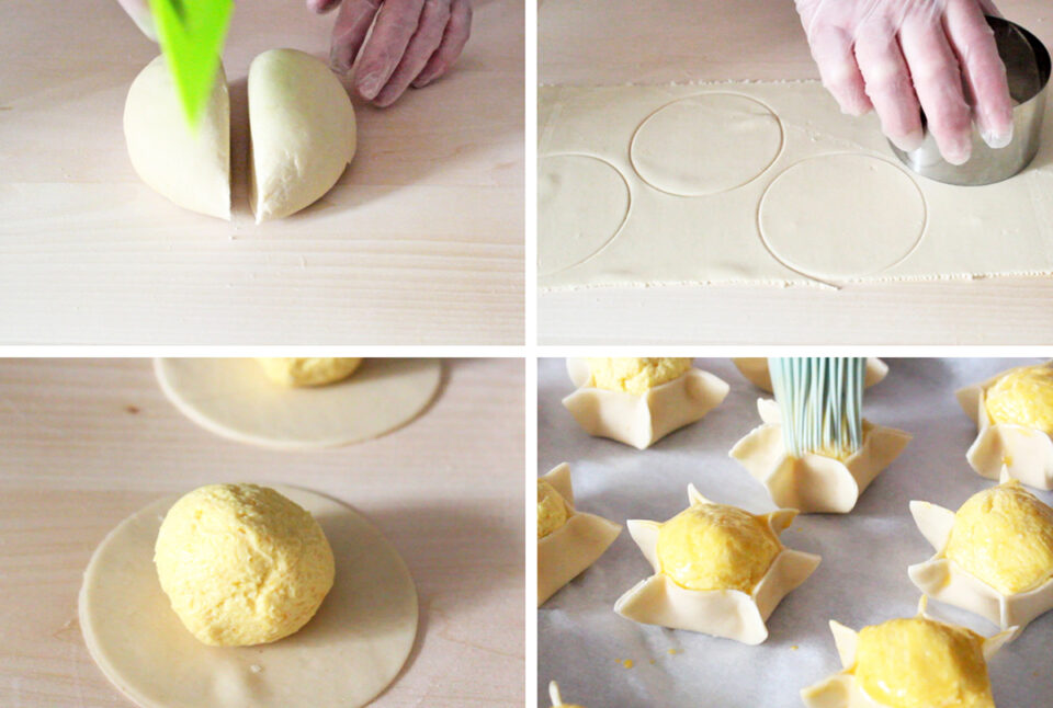 Ho disposto poi le Pardulas su una placca rivestita di carta da forno ben distanziate l’una dall’altra e con un tuorlo d’uovo e due cucchiai di latte ho spennellato la superficie del ripieno.