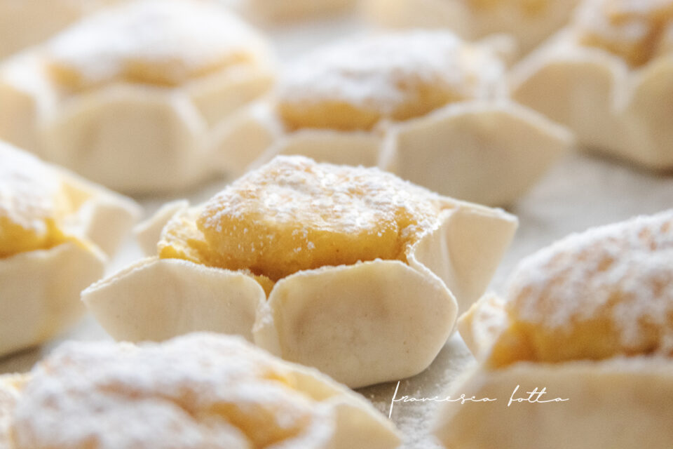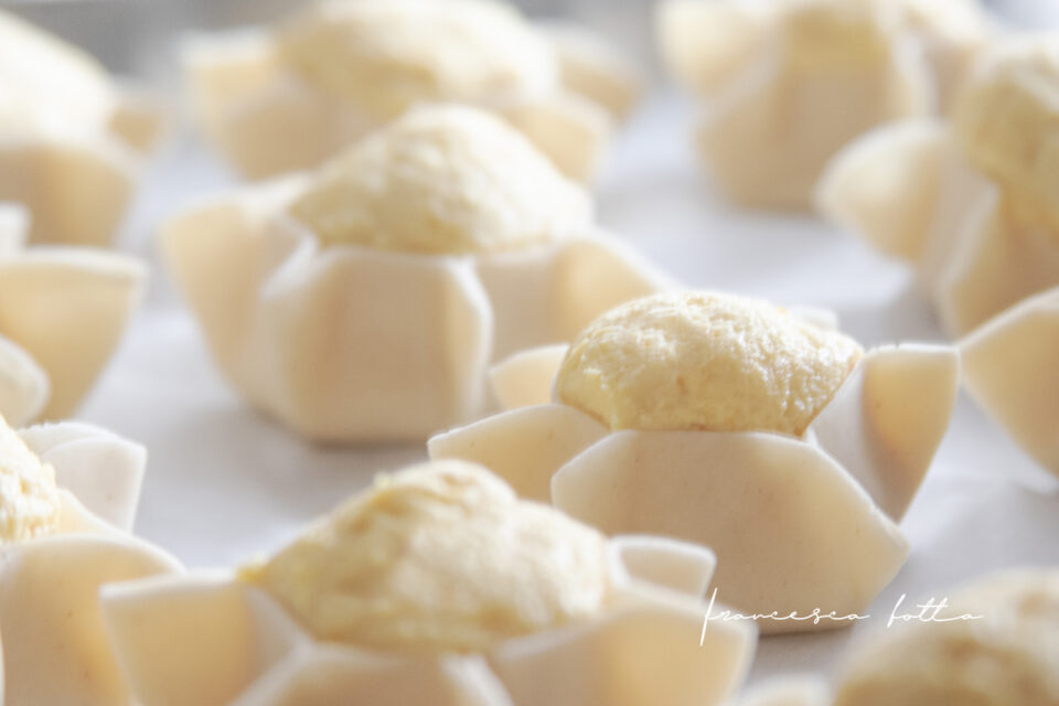 Ho ripreso l’impasto e l’ho steso con la sfogliatrice fino ad ottenere uno spessore di circa 2 mm. Poi, con un coppapasta tondo ho ricavato dei dischetti da 8cm di diametro. Ho messo al centro di ogni dischetto una pallina di composto grande come una noce. Per formare il cestinetto ho tenuto con la mano sinistra il disco con il ripieno e con la mano destra ho pizzicato i lati a intervalli equidistanti ed ho fatto in modo che l’involucro della pasta aderisse perfettamente al ripieno.