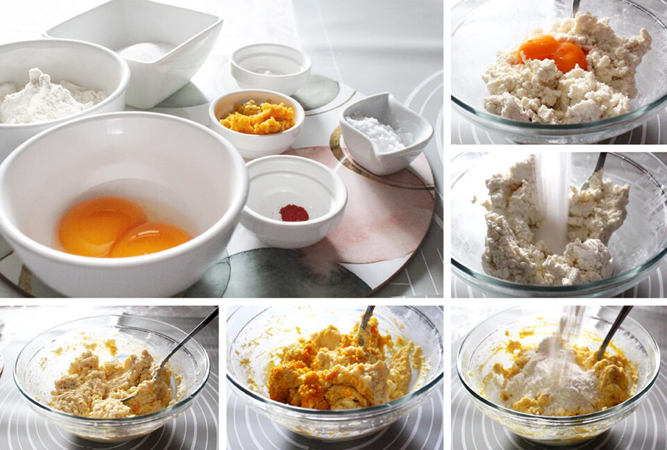 Per preparare il ripieno ho ripreso la ricotta e l’ho trasferita in una ciotola, ho unito lo zucchero ed ho lavorato i due ingredienti con una forchetta, ho poi aggiunto i 2 tuorli che avevo tenuto da parte, la farina, lo zafferano e le scorze grattugiate di un’arancia e di un limone. Ho mescolato il tutto e trasferito il ripieno in frigorifero a riposare per 15 minuti.