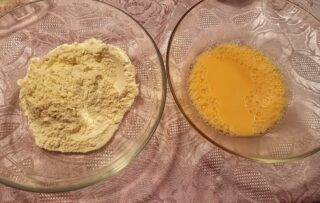 In un’altra ciotola unite acqua e uovo e mescolateli. Aggiungete e incorporate la farina di riso e il sale.