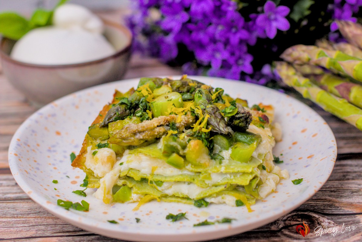 Ricetta del pasticcio con sfoglia fatta in casa e condita con burrata e asparagi. Servita con una spolverata di erbe fresche e scorza di limone.