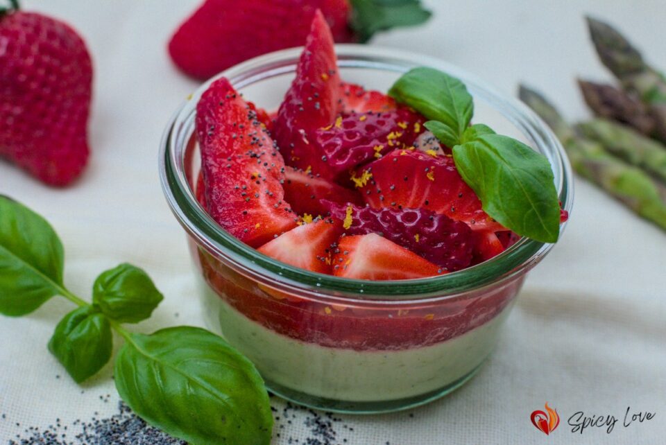 Ricetta della panna cotta agli asparagi verdi con coulis di fragole arricchita da brunoise di…