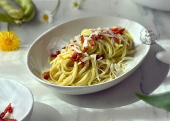 Primi piatti primaverili veloci: Un inno alla primavera. La dolcezza delle fave fresche si trasforma in una crema vellutata che sposa alla perfezione la sapiditĂ dello speck croccante.