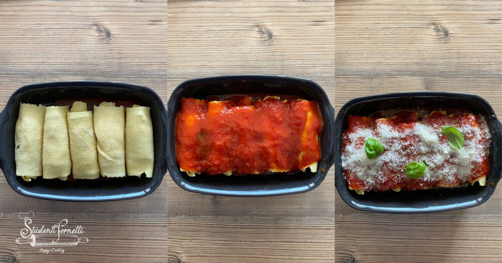 Si tratta di sfoglie di lasagna pronte, oggi facilmente reperibili anche in versione 100% vegetale senza uova, farcite con melanzane grigliate e formaggio vegetale a fette, poi arrotolate e cotte in forno con sugo di pomodoro e basilico. Un piatto semplice ma d’effetto.