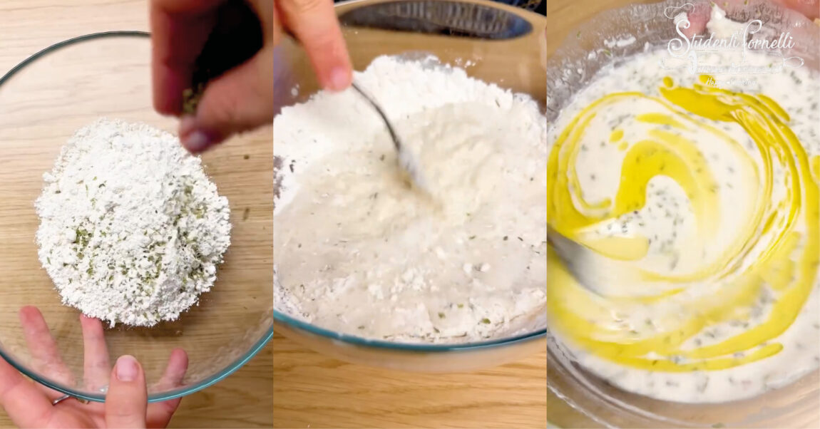 Prepara una pastella di acqua e farina mescolando fino a formare un composto senza grumi. Unisci olio extravergine di oliva e origano e mescola bene.