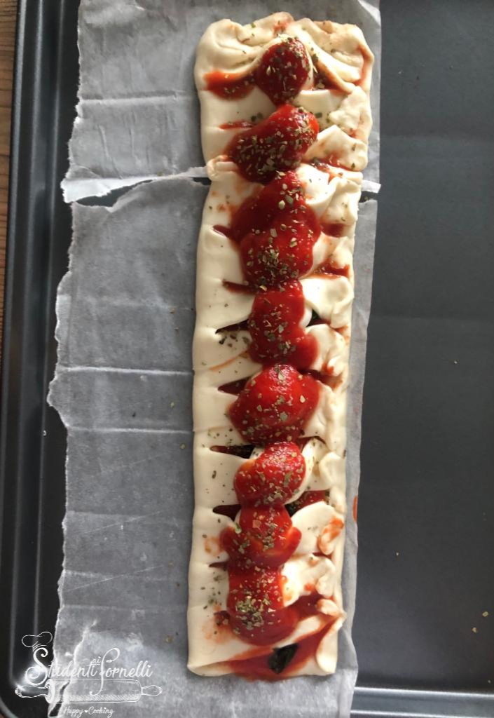 Per la ricetta davvero pochi ingredienti: impasto pizza o un rotolo di pizza già pronto che tipicamente si acquista al banco frigo, pomodoro, mozzarelline e aromi. Una sorta di treccia di pizza che viene preparata avvolgendo le strisce sul ripieno per un effetto ” a treccia” ma che chiaramente potete realizzare anche nella maniera tradizionale, chiudendo a “libro” l’impasto sul ripieno, a mo’ di saccottino o fagottino. Se proprio non avete l’impasto pizza potete realizzare il rusticotto anche con pasta brisée o pasta sfoglia.