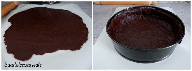 Tirare fuori dal frigo la pasta frolla al cacao e stenderla tra due fogli di carta forno fino ad uno spessore di 4 mm. circa. Ritagliare un cerchio e rivestire la base di una teglia a cerniera da 22 cm. precedentemente imburrata ed infarinata. Con la restante frolla ricavare una striscia per rivestire i bordi della teglia.