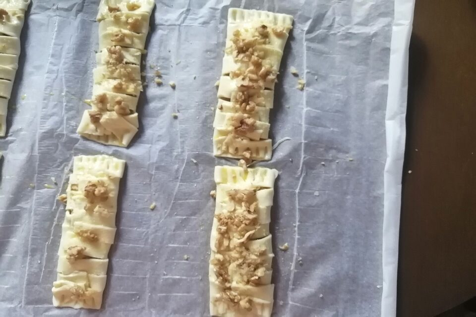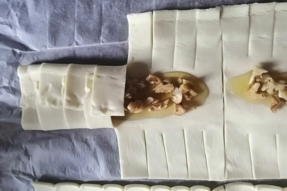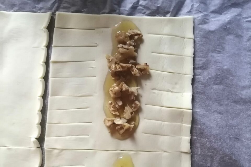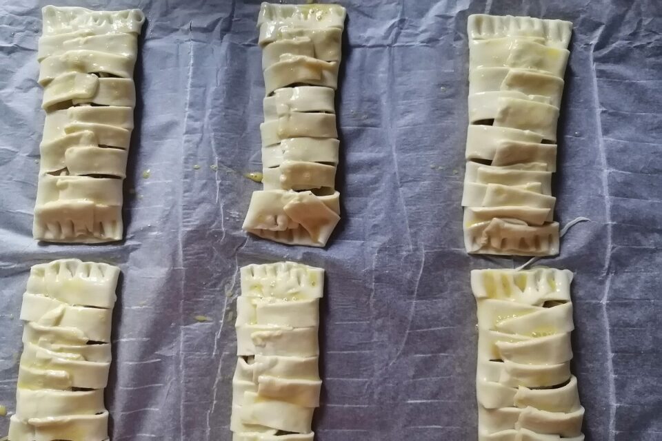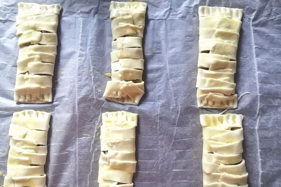 Apriamo il rotolo di pasta sfoglia e con una rondella tagliamolo in 6 rettangoli.