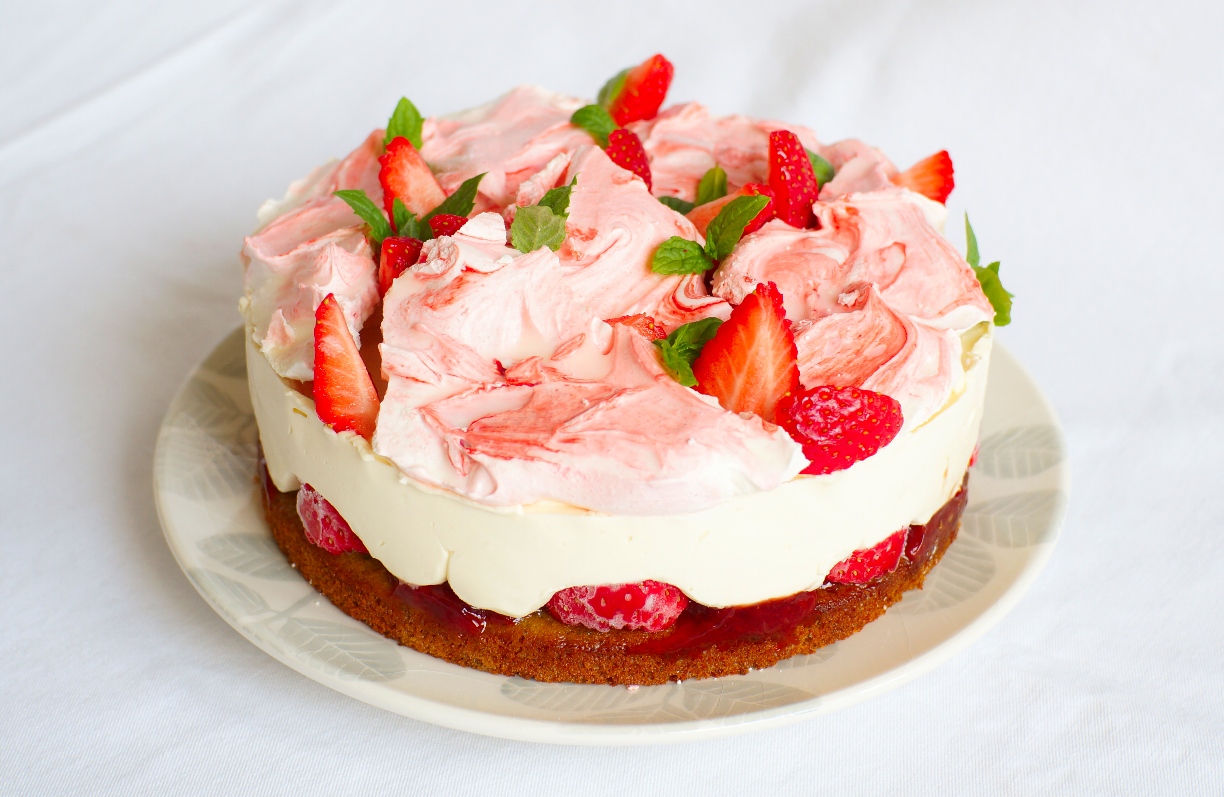 Per la decorazione: prendere il disco di meringa e romperlo in frammenti non troppo piccoli. Disporre sulla torta qualche cucchiaiata di cremoso tenuto da parte e disporvi i pezzi di meringa. Inframmezzare la meringa con spicchi di fragole e foglioline di menta.