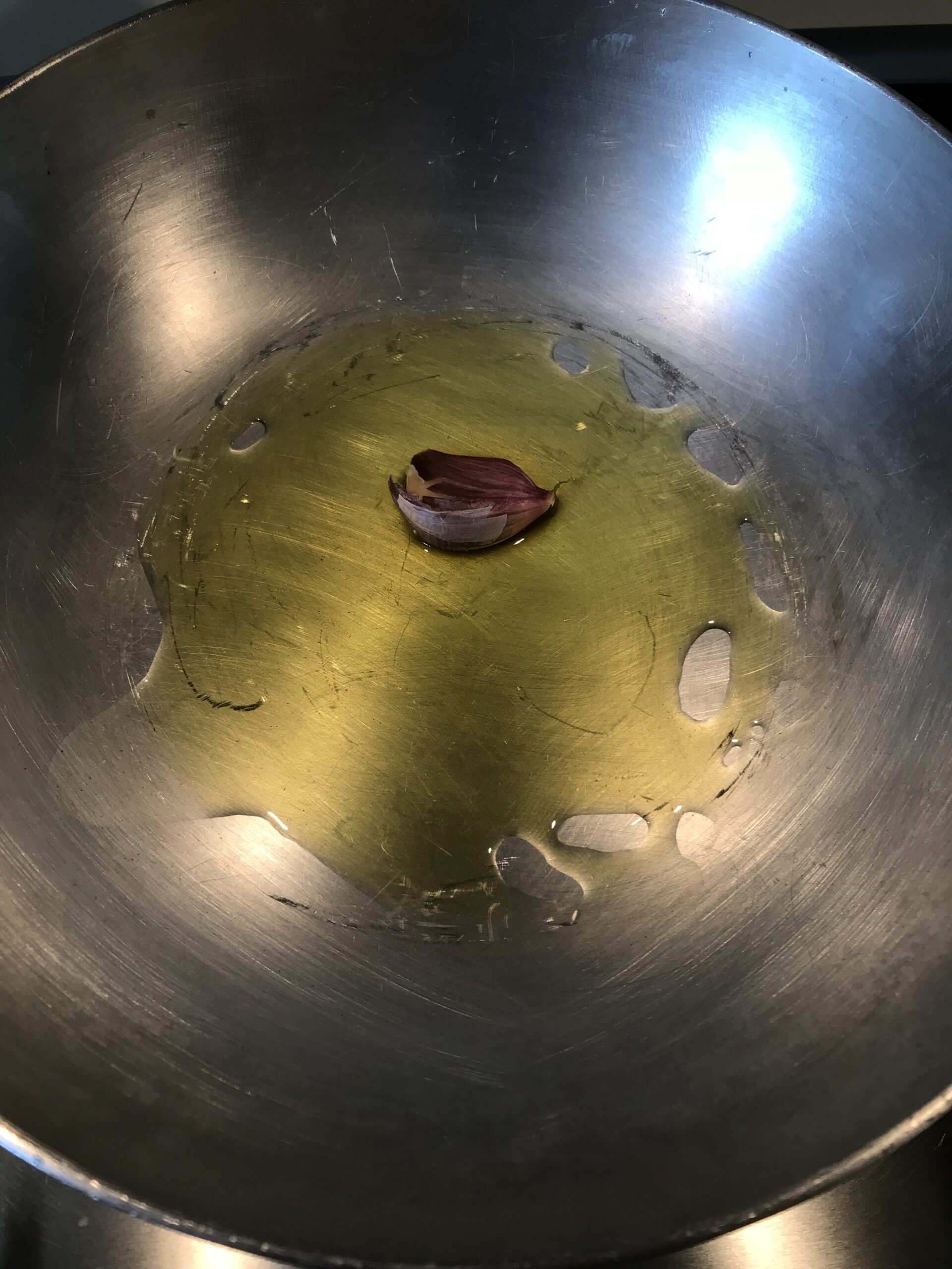 Versate il burro in una padella capiente ed una volta sciolto aggiungete l’olio e l’aglio in camicia, fate soffriggere leggermente inclinando la padella e permettendo all’aglio di essere completamente immerso.