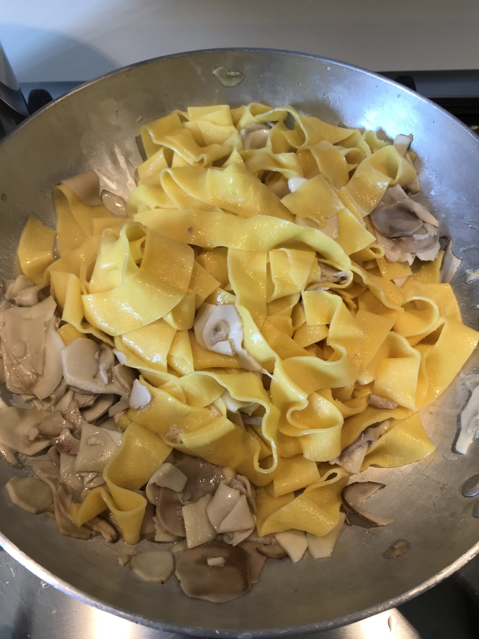 Ponete le pappardelle nella pentola con i funghi, accendete il fuoco ed amalgamate gli ingredienti.