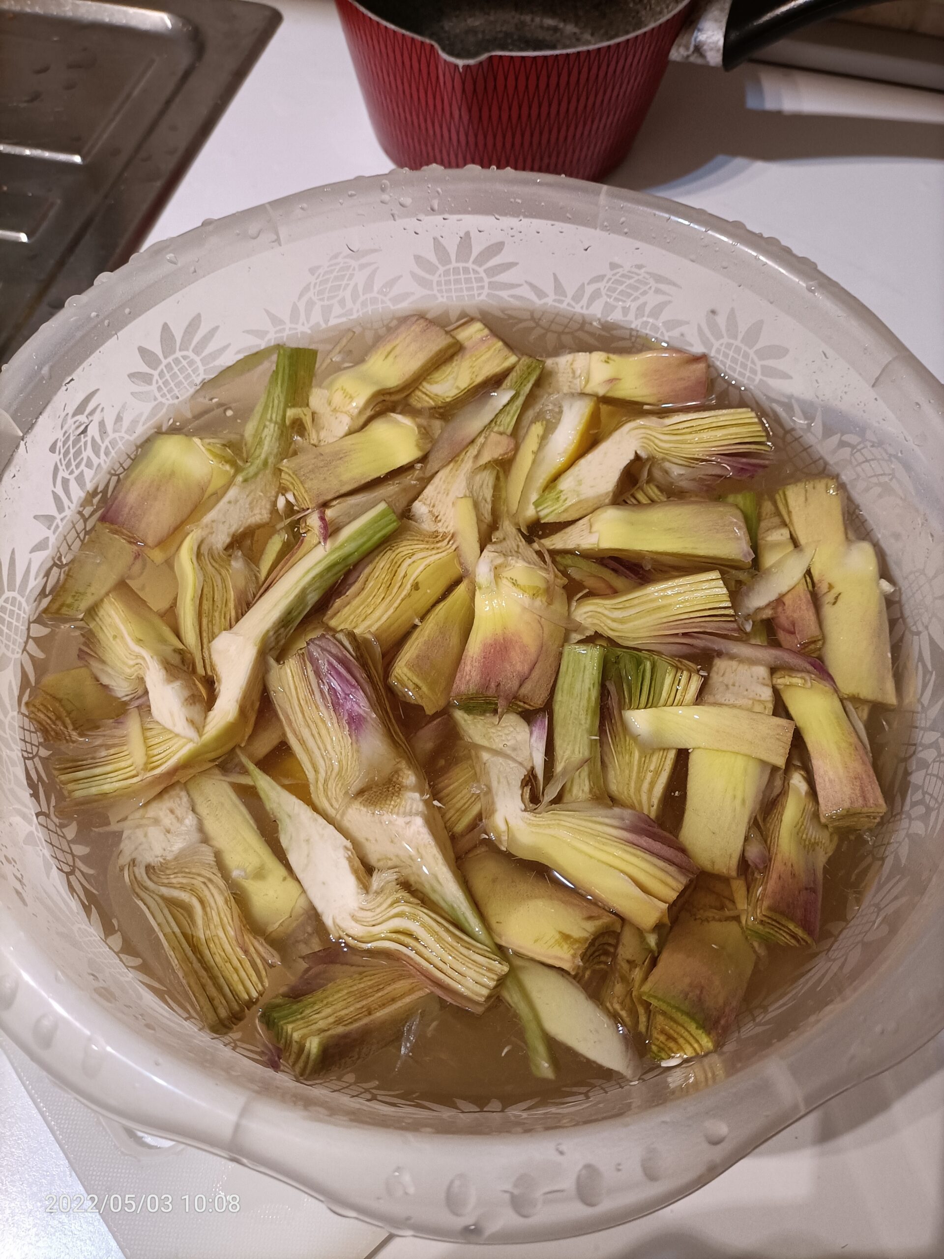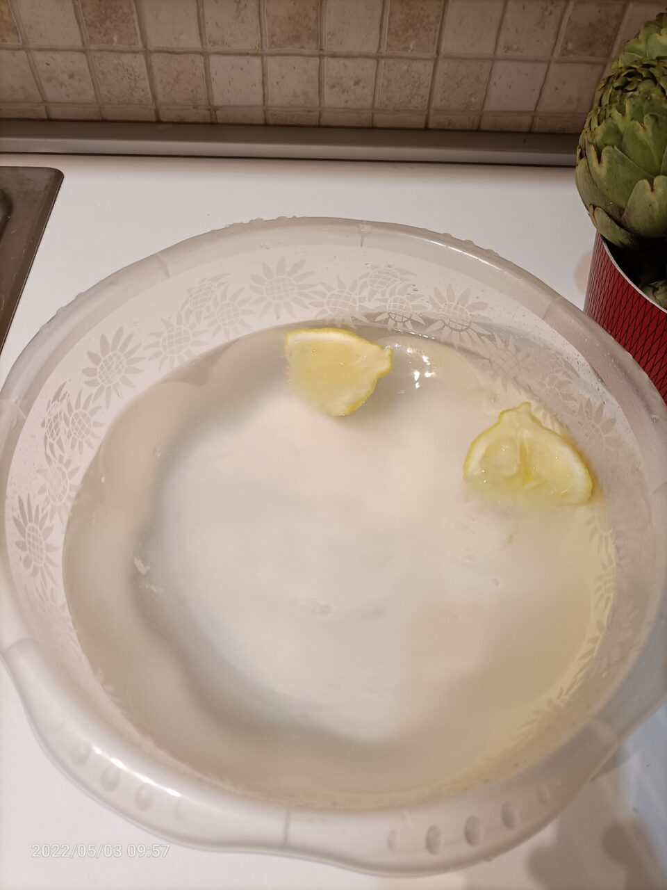 Preparazione della soluzione limonata: Iniziamo preparando una ciotola capiente con acqua e il succo di mezzo limone. Questa miscela aiuterà a mantenere i carciofi freschi e a prevenirne l’ossidazione, preservando il loro colore e sapore.