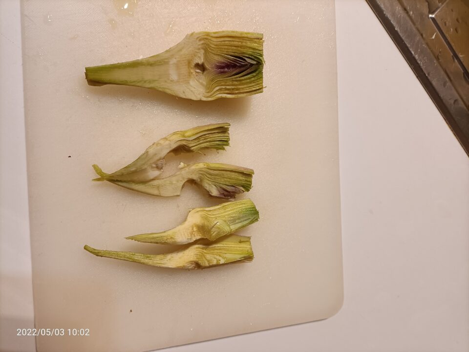 Pulizia dei carciofi: Eliminiamo le foglie esterne più dure e scure dei carciofi. Con un coltellino affilato, rimuoviamo la parte superiore delle punte spinose e, utilizzando un cucchiaino, scaviamo delicatamente al centro del carciofo per eliminare le setole o la “barbetta”.