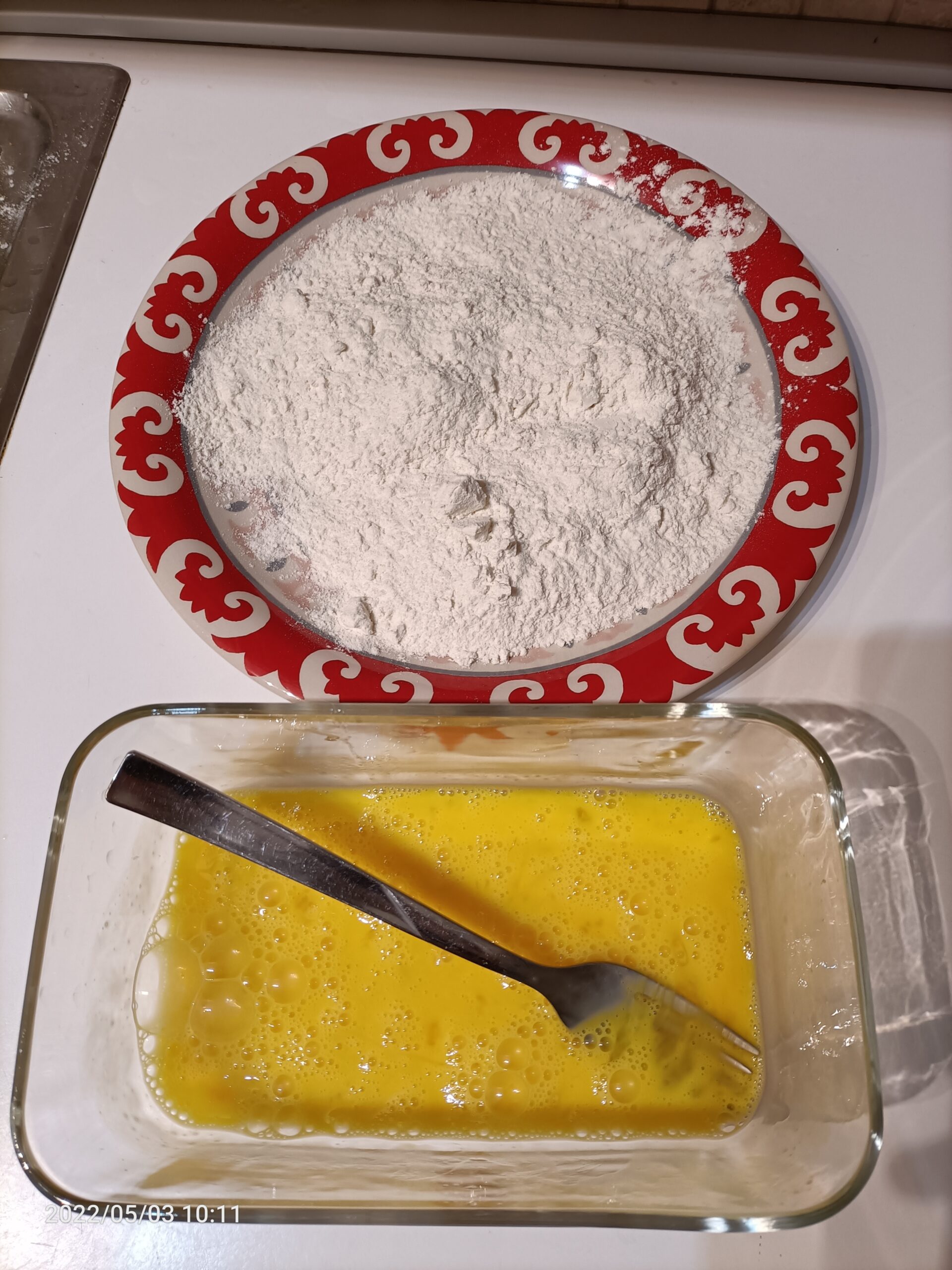 Preparazione dell’impanatura: In una ciotola capiente, sbattiamo le uova aggiungendo un pizzico di sale e pepe secondo il proprio gusto. In un piatto separato, versiamo la farina.