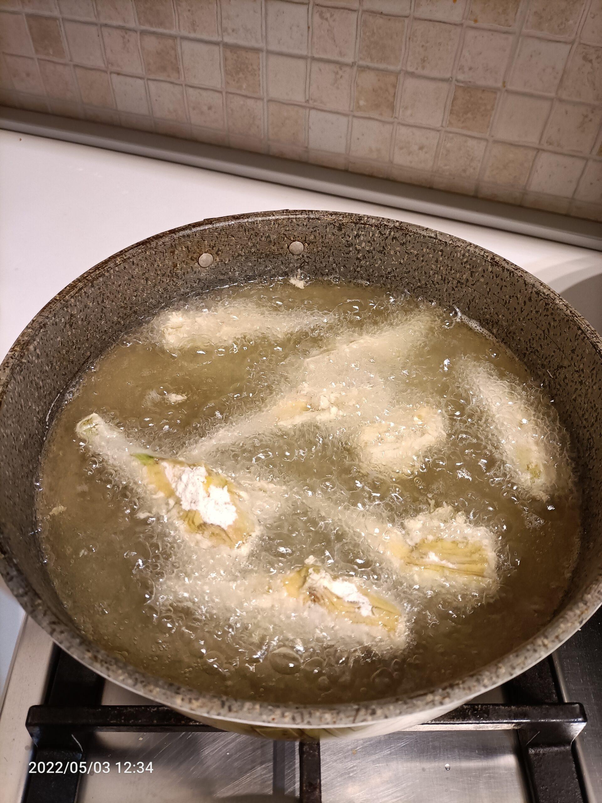 Frittura: In una padella capiente, scaldiamo l’olio di arachide fino a raggiungere la temperatura ideale per friggere. Una volta caldo, immergiamo pochi spicchi di carciofo per volta, evitando di sovraffollare la padella. Friggiamo fino a quando non diventano dorati e croccanti.