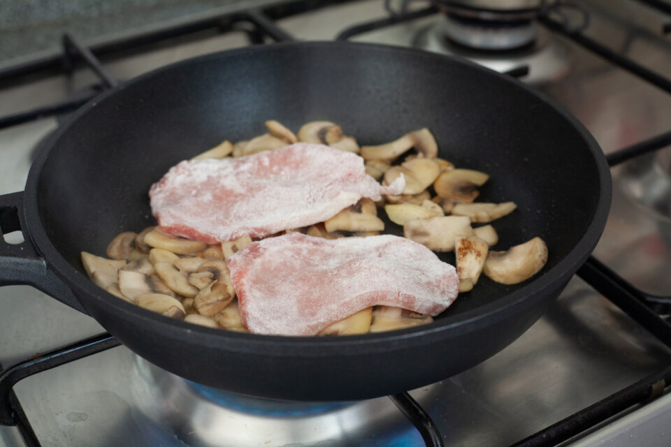 A questo punto prendete le fette di arista infarinata e inseritela dentro la padella con i funghi. Sfumate con del vino bianco (o in alternativa acqua calda o brodo) e portate a cottura. Ci vorranno almeno altri 5 – 10 minuti. Deve crearsi una crema non troppo densa.