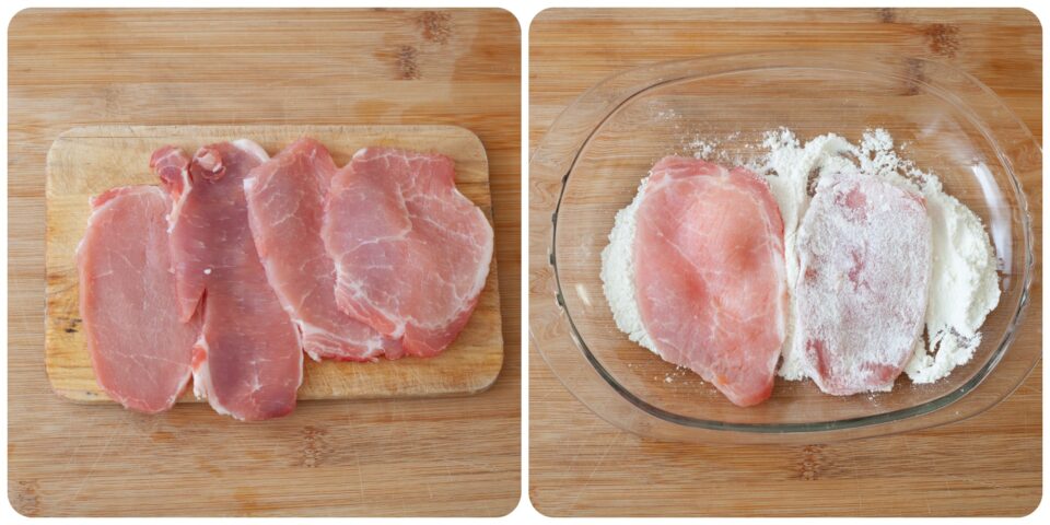 Nel frattempo prendete l’arista di maiale, togliete il grasso evidente sui bordi (o se vi piace potete anche lasciarlo) e battetela leggermente con un bicchiere se non avete il batti carne poi passatela nella farina predisposta dentro un piatto.