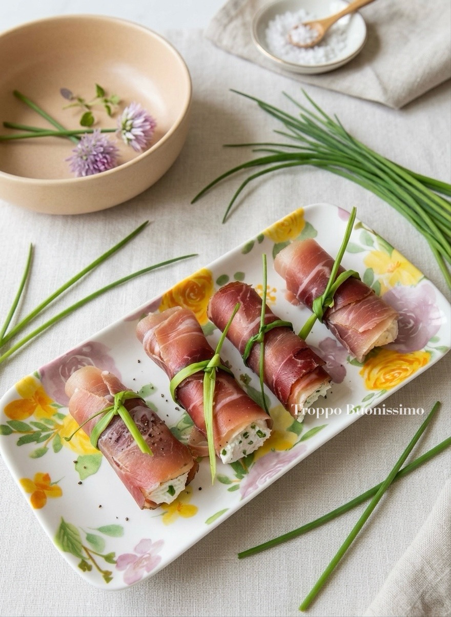 Questa ricetta senza cottura per gli involtini di speck, erba cipollina e caprino è facile e veloce da preparare, e il sapore del formaggio di capra fresco si combina perfettamente con l’aroma del salato speck e la freschezza dell’erba cipollina. Buon appetito!