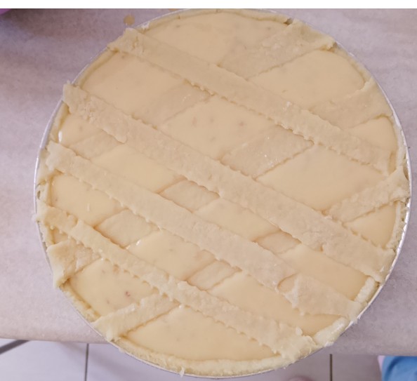 Versate delicatamente il ripieno e decorate con le classiche 7 strisce di pasta che avrete preparato.