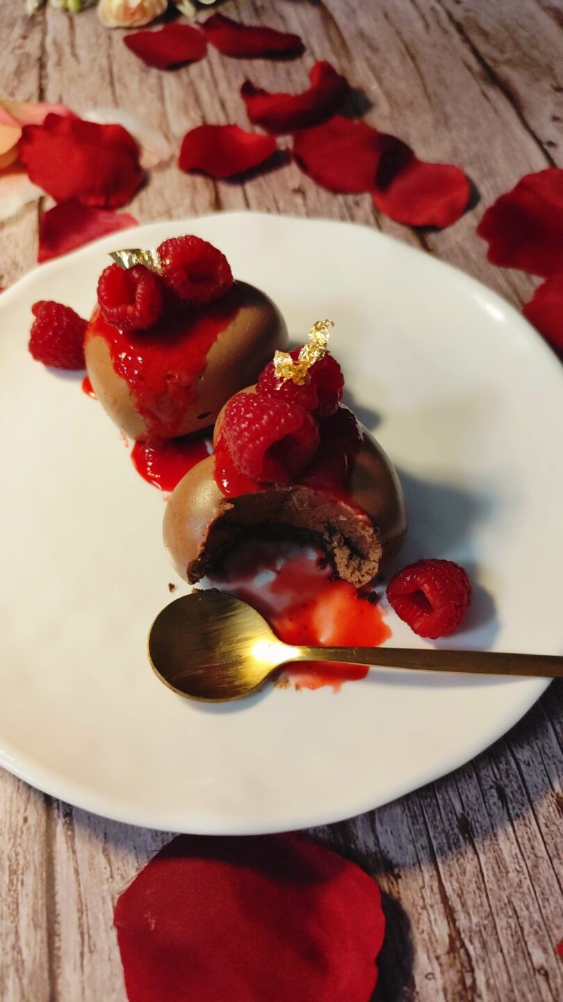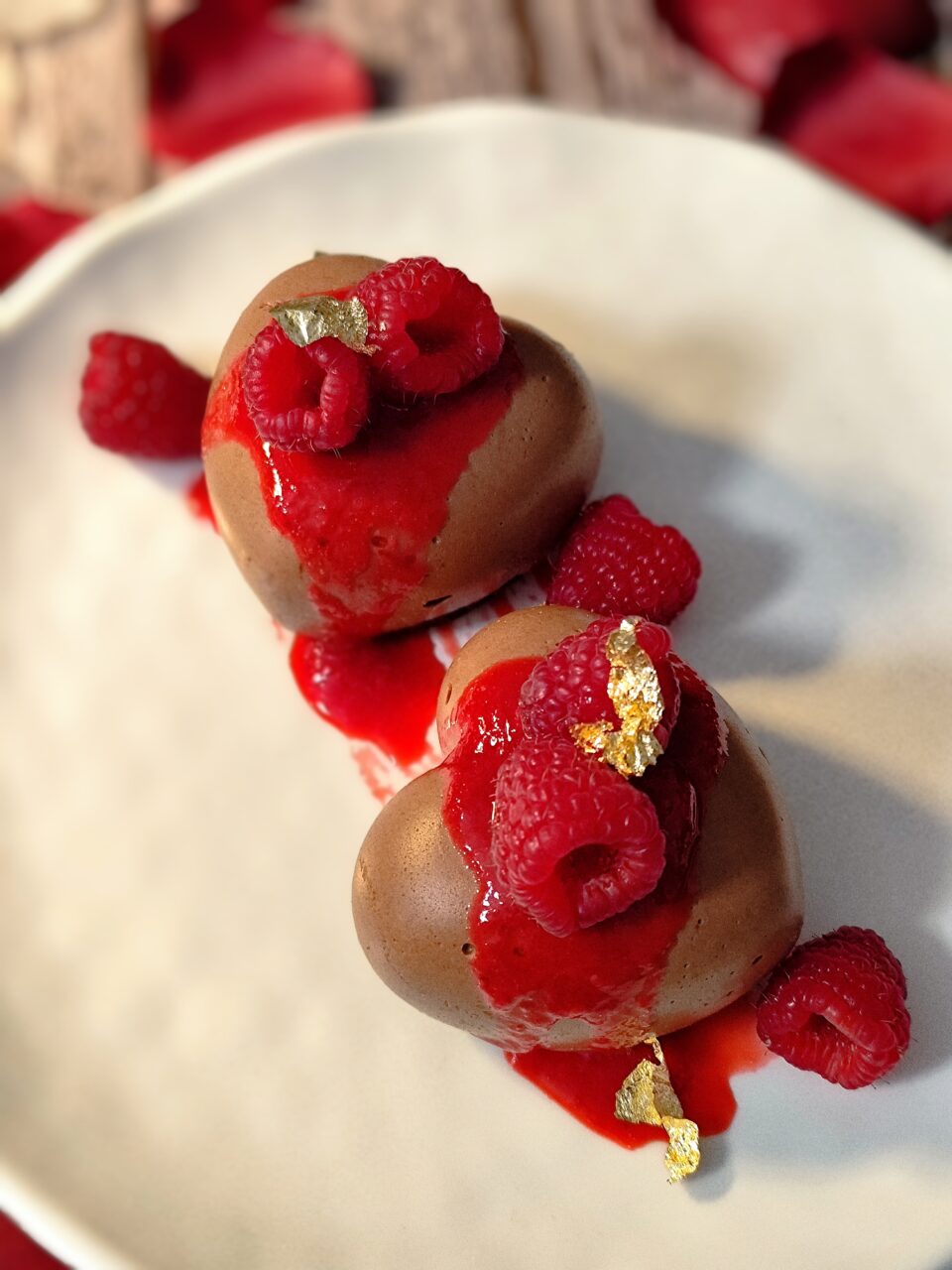 Impiatta con il coulis, i lamponi freschi e la foglia d’oro.