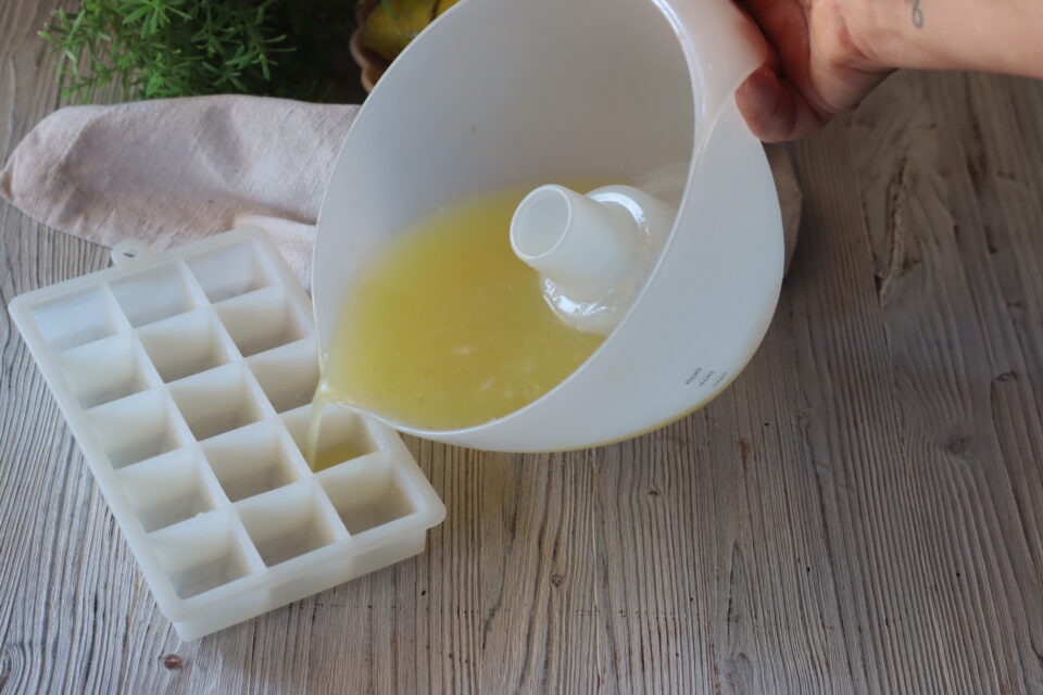 Dividete il succo di limone nell’apposito contenitore per preparare i cubetti di ghiaccio.