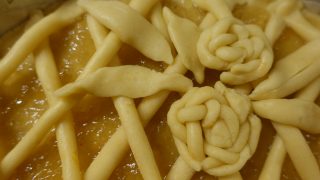 Preparate dei cordoncini di varie lunghezze e intrecciateli sulla crostata per creare un effetto rete, decorate con rose di pasta frolla a vostro piacimento mettete al forno per trenta minuti a 180°