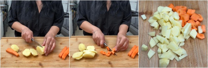 Tagliate a pezzetti le carote e unitele alle patate.