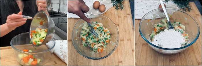 Scolate le verdure e trasferitele in una ciotola, schiacciatele con una forchetta mentre sono ancora calde e lasciatele intiepidire.