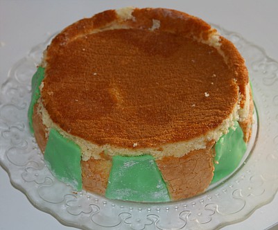 Cospargete di zucchero a velo la tortiera, tagliate un disco di pan di spagna e mettetelo nello stampo e inumiditelo con la bagna, tagliate il pan di spagna rimanente a strisce alte circa 6 cm e rivestite anche il bordo dello stampo, se volete, potete alternare trapezi di pan di spagna al marzapane, io ci ho provato ma è molto complicato, poi ho rivestito tutto perché non era proprio bellissima.
