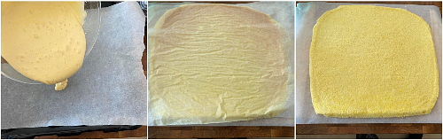 Mettete il composto in una teglia con carta forno, meglio se rettangolare, in modo da ricavare più facilmente le strisce in seguito, livellate e fate cuocere il Pan di Spagna in forno statico precedentemente preriscaldato a 170° per 20-25 minuti.